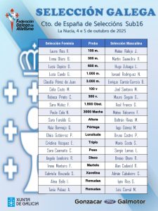 Un total de 34 atletas forman a Selección Galega Sub16 que acudirá esta fin de semana a tomar parte no Campionato de España por Federacións que se levará a cabo no Estadio Olimpic Camilo Cano da localidade valencía de la Nucía, organizado pola Real Federación Española de Atletismo, por delegación do Consello Superior de Deportes, en colaboración co Concello de La Nucía, a Federación de Atletismo de la Comunidad Valenciana e as Federacións Españolas de Deporte Adaptado