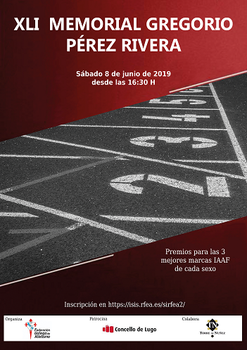 A Federación Galega de Atletismo a través da súa Delegación en Lugo, organiza co patrocinio do Excelentisimo Concello de Lugo a 41ª edición do MEMORIAL GREGORIO PÉREZ RIVERA, o sábado 8 de xuño, en xornada de tarde, no Estadio Gregorio Pérez Rivera.