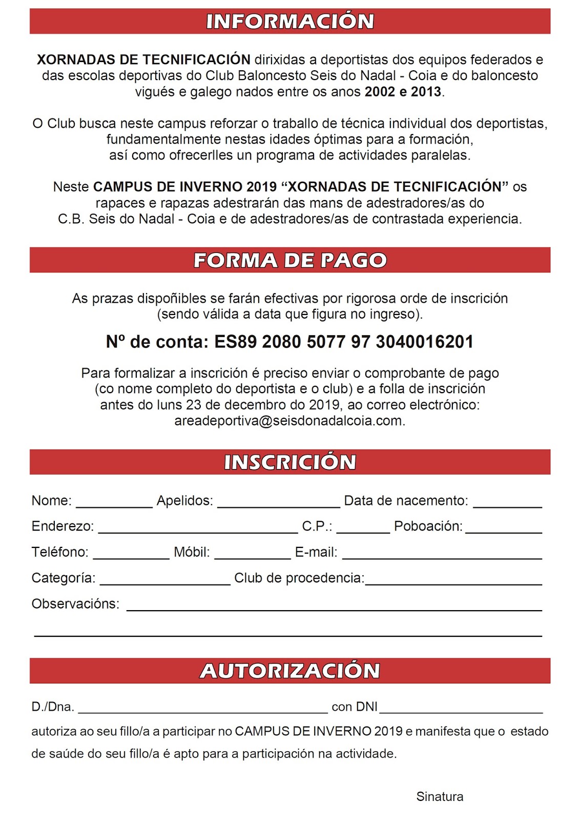 As prazas dispoñibles para estas Xornadas de Tecnificación 2019 son limitadas e se farán efectivas por rigorosa orde de inscrición (sendo válida a data que figure no ingreso). Para formalizar a inscrición é preciso enviar o comprobante de pago (co nome completo do deportista e o club ao que pertence) e a folla de inscrición, antes do 23 de decembro do 2019 ao mail areadeportiva@seisdonadalcoia.com.