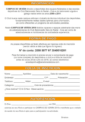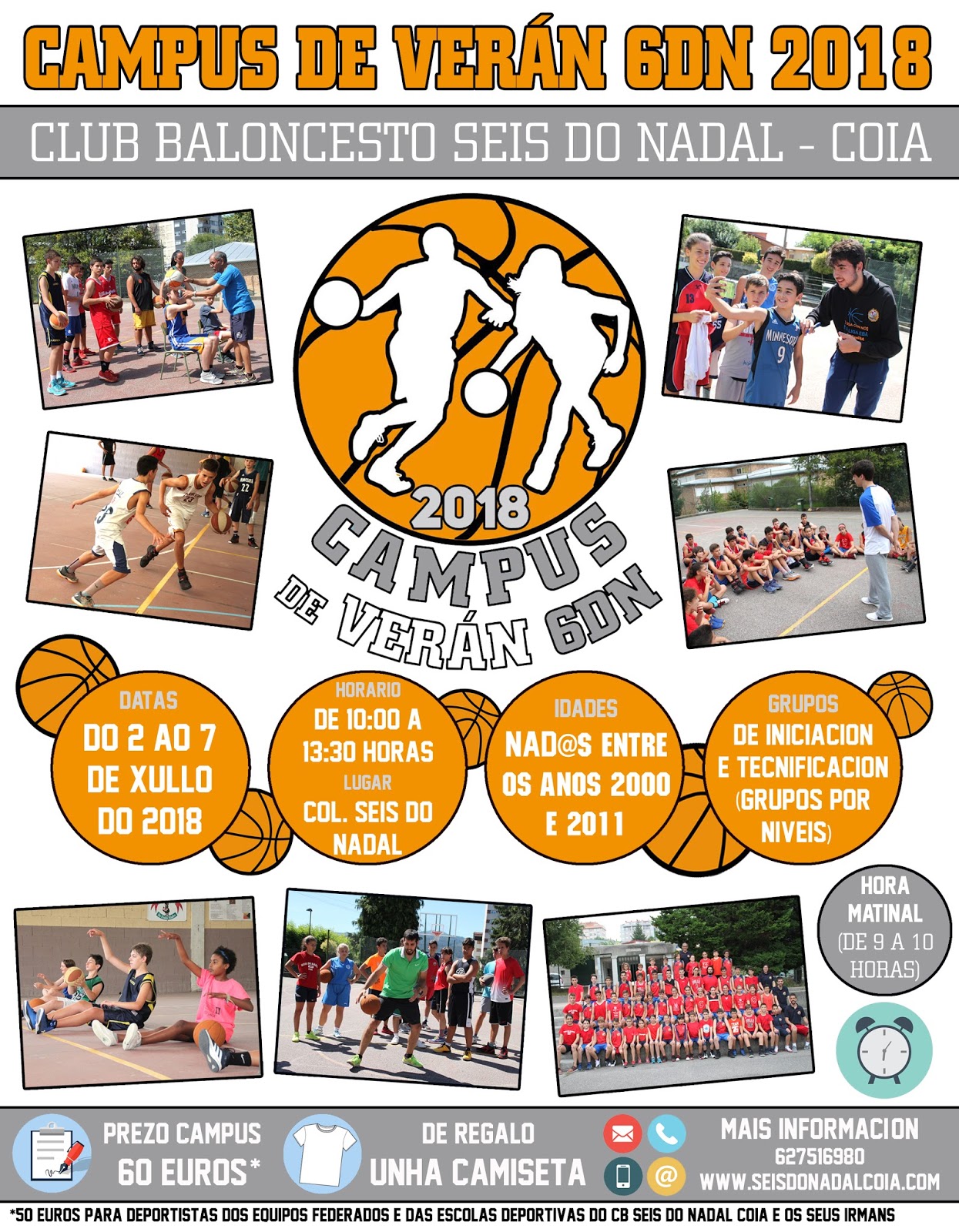 Durante a semana do 2 ao 7 de xullo do 2018 celebrarase nas instalacións do Colexio Seis do Nadal o Campus de Verán 2018 organizado un ano máis polo Club Baloncesto Seis do Nadal – Coia dirixido a nenos e nenas de entre 6 e 17 anos.