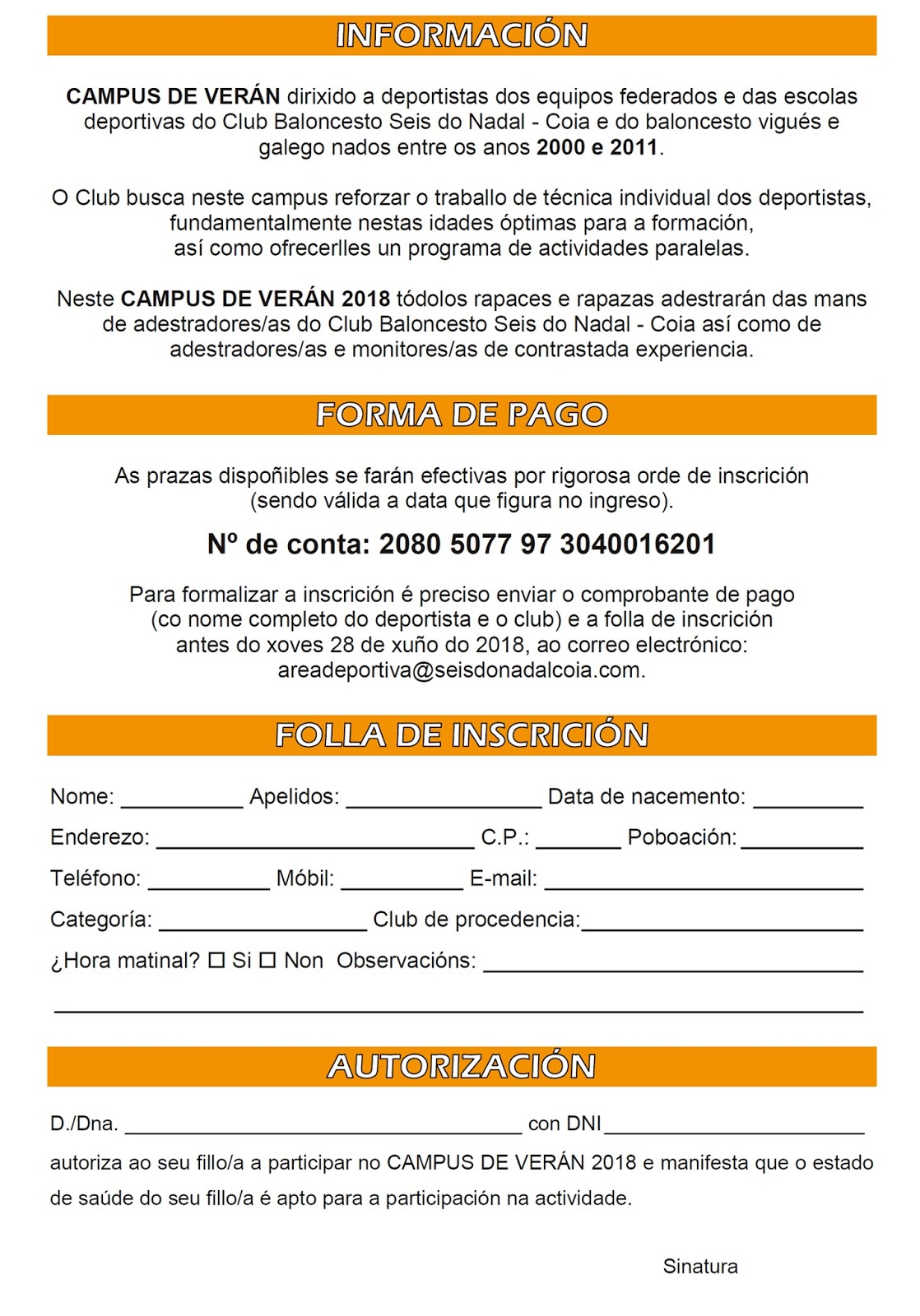 As prazas dispoñibles para o Campus de Verán son limitadas e éstas se farán efectivas por rigorosa orde de inscrición (sendo válida a data que figure no ingreso realizado). Para formalizar a inscrición é preciso enviar o comprobante de pago (co nome completo do deportista e o club ao que pertence) e a folla de inscrición, antes do xoves día 28 de xuño do 2018, ao email areadeportiva@seisdonadalcoia.com.