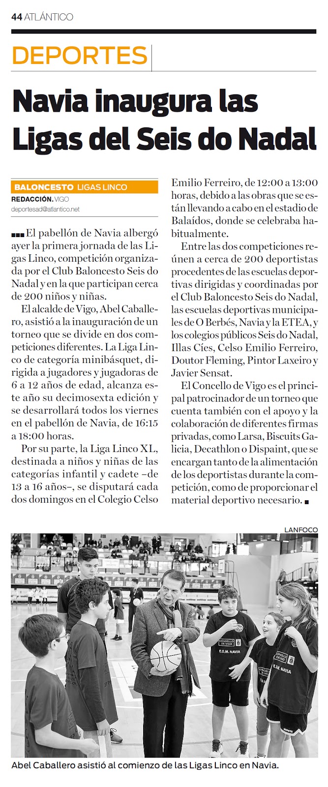 "Navia inaugura las Ligas del Seis do Nadal. El pabellón de Navia albergó la primera de las jornadas de las Ligas Linco, competición organizada por el Club Baloncesto Seis do Nadal y en la que participan cerca de 200 niños y niñas."