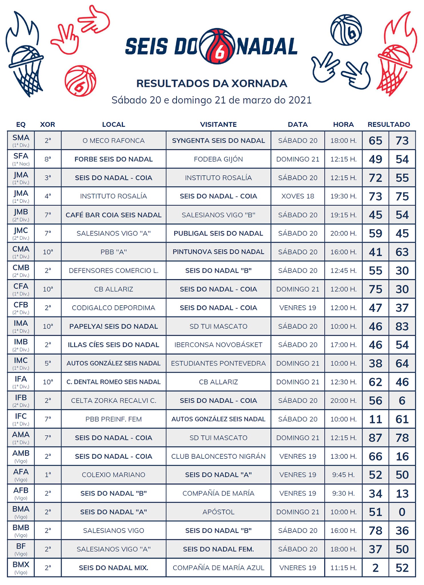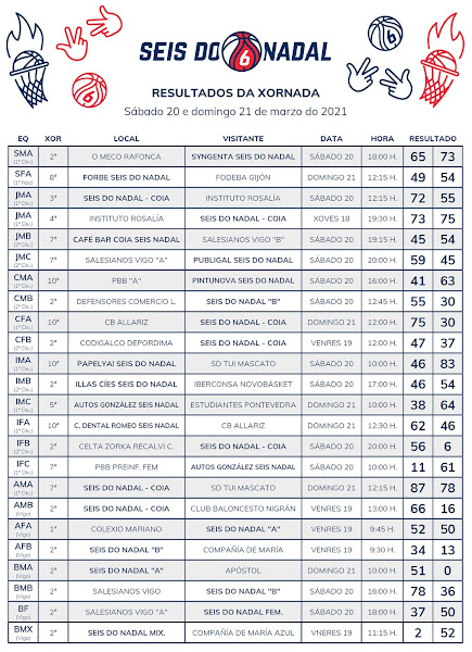Baloncesto marzo 22, 2021abril 7, 2021 RESULTADOS DA XORNADA: SÁBADO 20 E DOMINGO 21 DE MARZO DO 2021 Enviado por:Deporte Galicia Baloncesto Publicado por: Seis do Nadal Basket Enlace con la noticia original: RESULTADOS DA XORNADA: SÁBADO 20 E DOMINGO 21 DE MARZO DO 2021