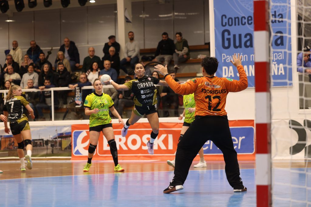 El tiempo corría y la misma tónica se mantenía, con ambos conjuntos cometiendo bastantes errores en el juego de ataque, y encontrándose ahora también con Sabina Mínguez y Geandra Rodrigues en sendas porterías para frenarlos cada vez que lograban llegar a ellas. Tuvo que esperar el encuentro al minuto 11 para ver cambios en el marcador, que llegaron de la mano de Blanca Benítez en penalti y siguieron con un tiro directo de Mina Novovic tras una falta. El Guardés solo tuvo oportunidad de reaccionar también desde la línea de siete metros, pero Rosane Serrano la mandó al poste y Rodrigues encadenó parada tras parada para ponerlo todavía más difícil. Un último acierto de Lorena Pérez desde el extremo fue la gota que colmó el vaso para que Ana Seabra parase el tiempo e intentase reconducir un partido que las suyas ya perdían por tres goles (2-5, min. 16).