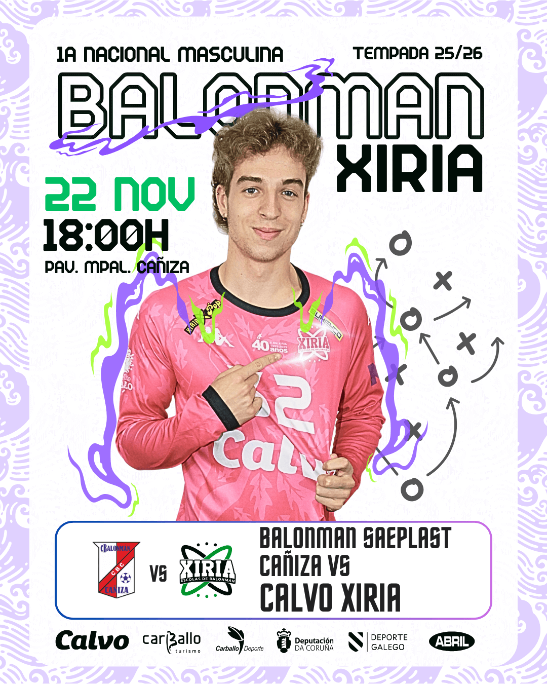 O Pavillón Municipal da Cañiza acollerá este sábado 22 de novembro ás 18:00h un duelo de Primeira Estatal Masculina (Grupo A) que enfrontará ao equipo local, SAEPLAST BM. CAÑIZA, contra o CALVO XIRIA de Carballo.